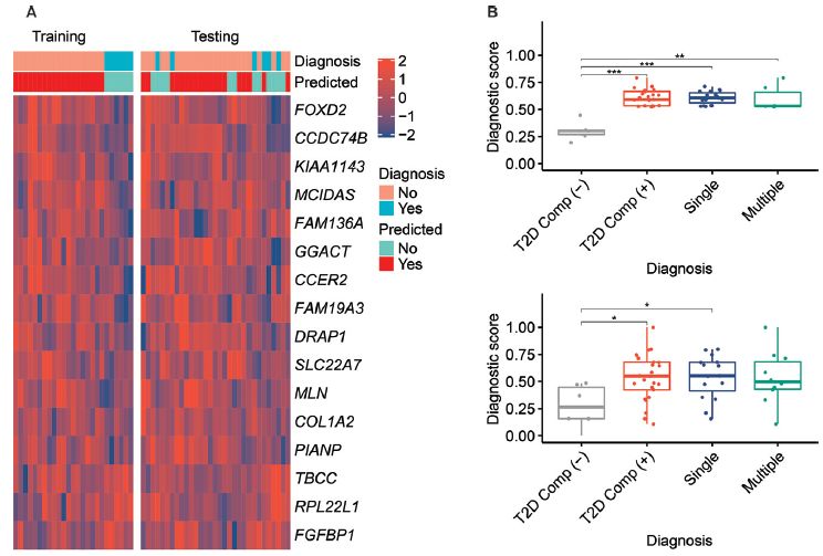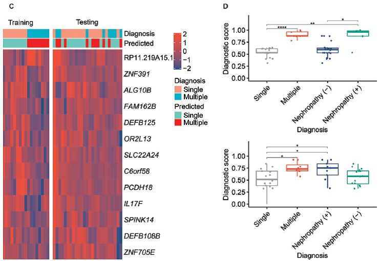 50例有并发症的2型糖尿病病人被随机分成训练组(n=25)和测试组(n=25)。利用弹性网络筛选后发现,13基因-5hmC标志物组合可以区分2型糖尿病病人是否发生单一并发症或多种并发症。