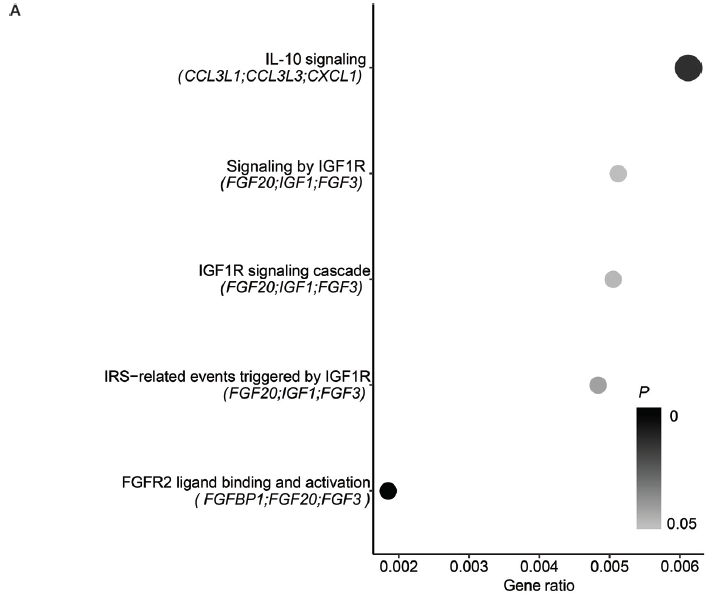有并发症和无并发症病人的135个差异候选基因的功能注释分析表明,这些基因主要富集在一些经典的信号通路。错误发现率相关P值位于前10%和基因数目≥3的信号通路包括由IGF1R, IL-10和FGFR2所介导的信号通路。由IGF1R和IL-10介导的信号通路与胰岛素抵抗及炎症反应相关,在血管生物学和糖尿病发生发展过程中发挥重要作用。