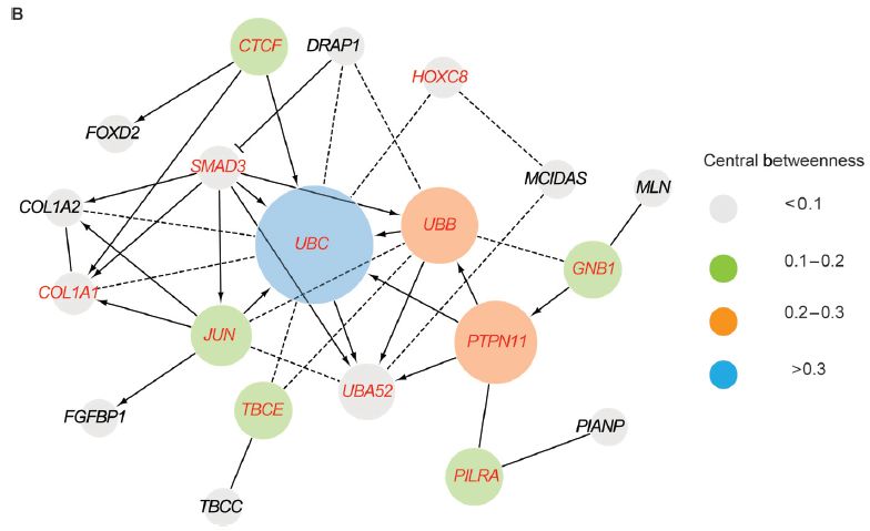 Reactome相互作用网络的中心表明,泛素编码基因[泛素B (UBB),泛素C (UBC),泛素A-52亚基核糖体蛋白融合产物1(UBA52)]是候选基因(如SMAD3FOXD2DRAP1MCIDASMLNPIANPTBCC)的重要连接者。在这135个差异候选基因中, 一些基因 (如TNFRSF25P=0.027, HR=6.25; MLNP=0.0021, HR=20.40; CCL3L1P=0.018, HR=0.44)表现出与糖尿病病程相关的倾向,表明5hmC和糖尿病血管并发症之间可能存在时间依赖性的相互作用。基于纵向时间队列的大样本研究,将可进一步明确5hmC变化和糖尿病持续时间之间的动态关联。关于单一并发症和多种并发症病人的159个候选标志基因的功能注释研究发现,存在细胞-细胞连接、胶原蛋白形成、新陈代谢、细胞应激应答信号通路的富集,这些信号通路均与细胞基本功能密切相关。